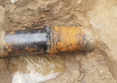 ‘s Avonds werden wij gebeld door Waternet, met de melding dat er een spoelgat was ontstaan onder het asfalt. Diezelfde avond de weg voor een gedeelte afgezet, zodat het gevaar in eerste instantie voor het autoverkeer weg te nemen. De volgende dag gestart met graven en geconstateerd dat een rond 400 gietijzeren persleiding (leiding die als de pomp aanslaat zo een 300m3 per uur afvoert) spoelde bij een koppeling. Voor de nacht tijdelijk een aanstorting gemaakt, zodat de persleiding weer in werking gezet kon worden om het vuile water uit de achterliggende wijken af te voeren. De volgende dag een stuk van de buis ertussenuit gezaagd en met speciale reparatiekoppelingen weer aan elkaar gemaakt. Vervolgens de verharding teruggebracht, waardoor de weg weer open kon.