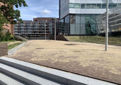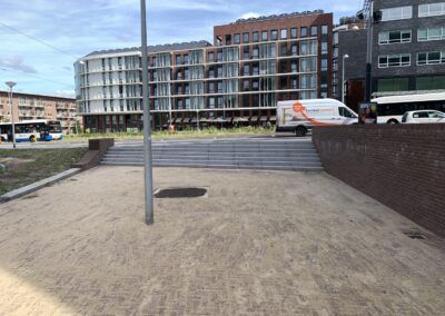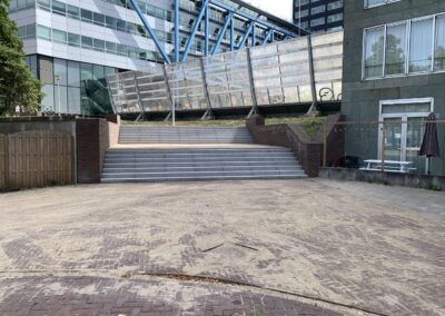 De herinrichting zijn wij gestart met het volledig verwijderen van al het groen en bestrating en teven het slopen van de oude trapconstructies. De grootste uitdaging met het sloopwerk was dat één van de trappen was verbonden met de omliggende Monumentale gebouwen. Deze trap moest volledig gezaagd worden om los te komen van het gebouw en kon vervolgens voorzichtig gesloopt worden.